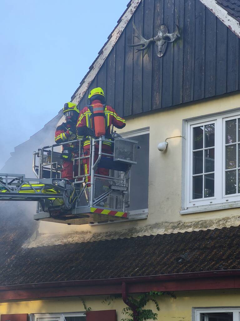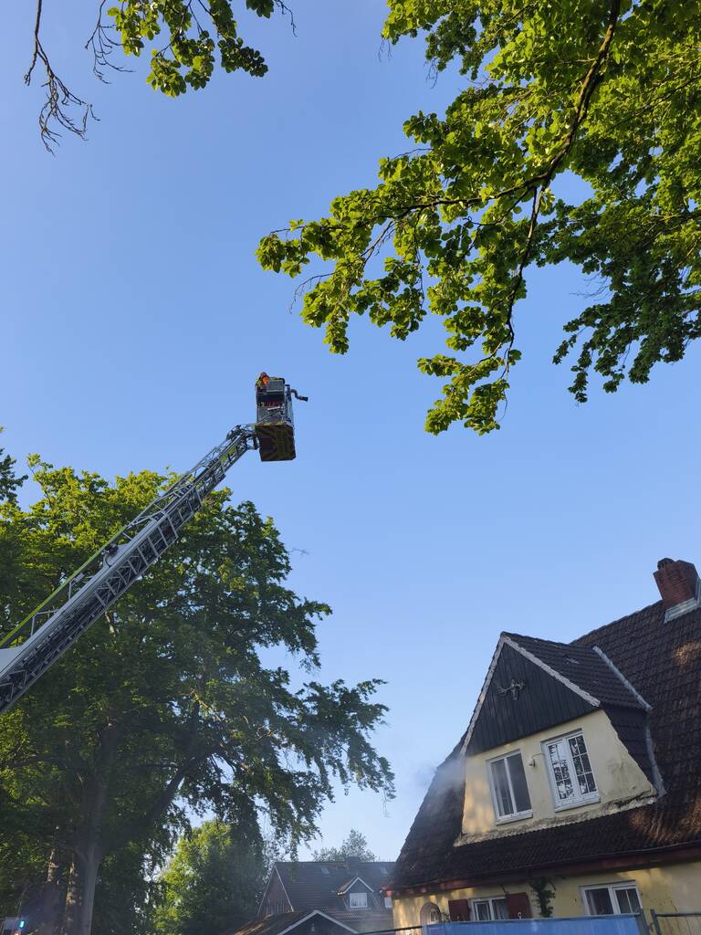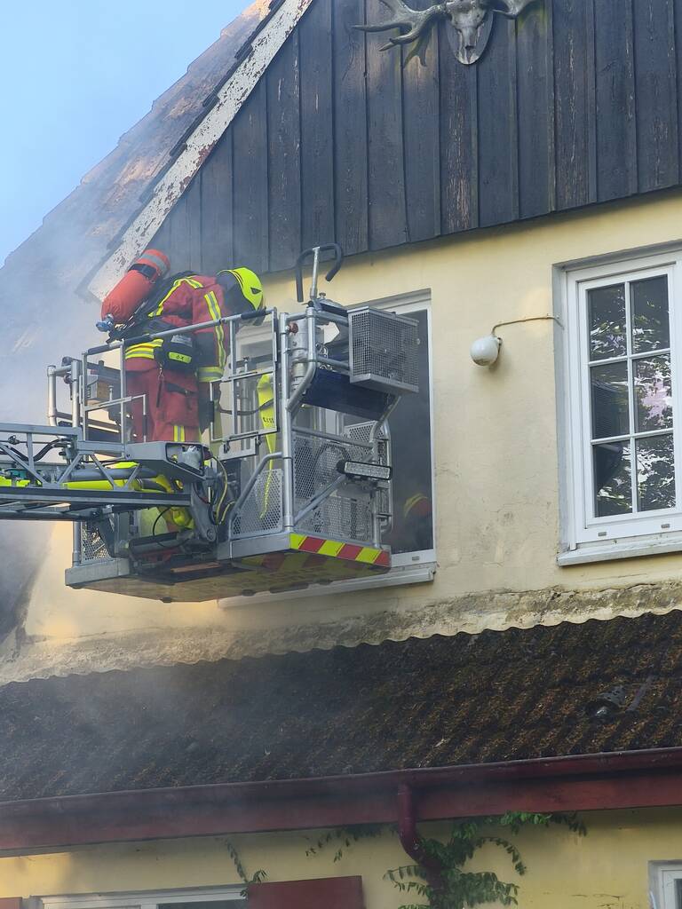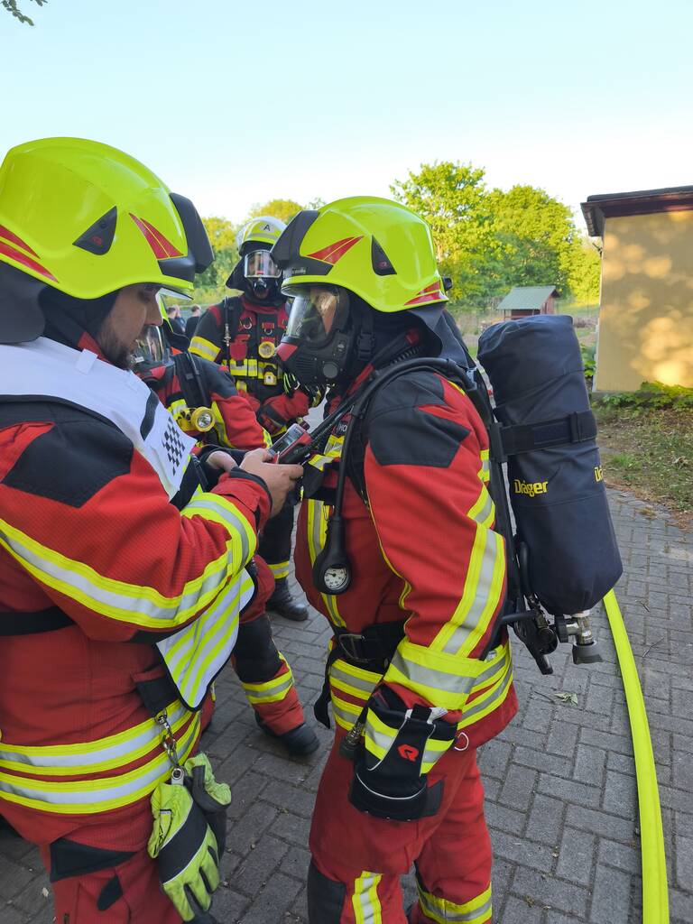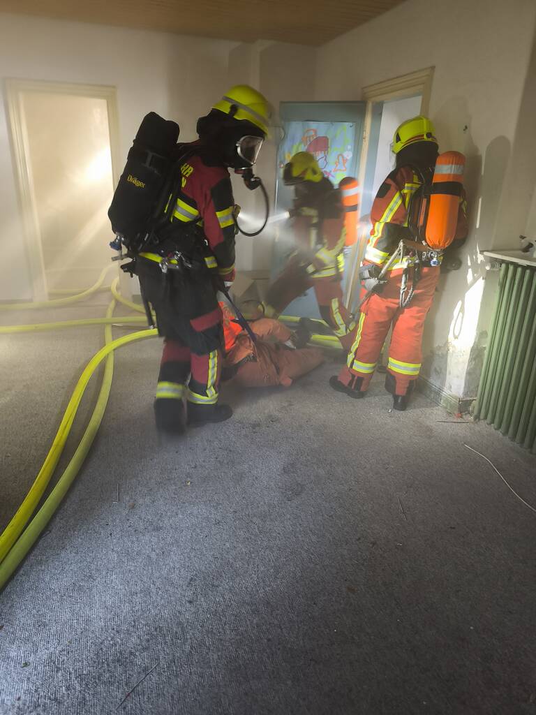 Die Freiwilligen Feuerwehren Schellhorn und Preetz übten an einem Abrisshaus die Personenrettung aus einem „brennenden“ Gebäude. Sowohl über die Drehleiter als auch durch die Türen zum Haus wurden durch Atemschutzgeräteträger der beiden Feuerwehren mehrere Personen aus dem Gebäude gerettet.